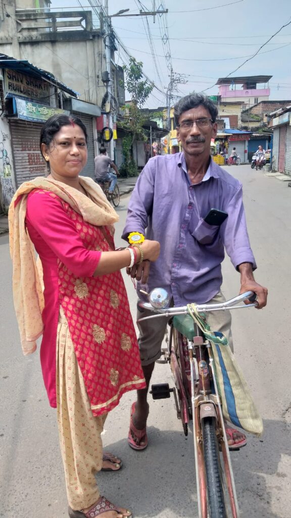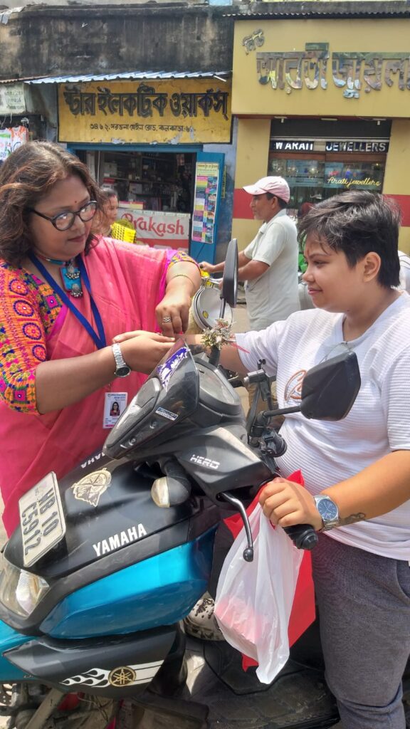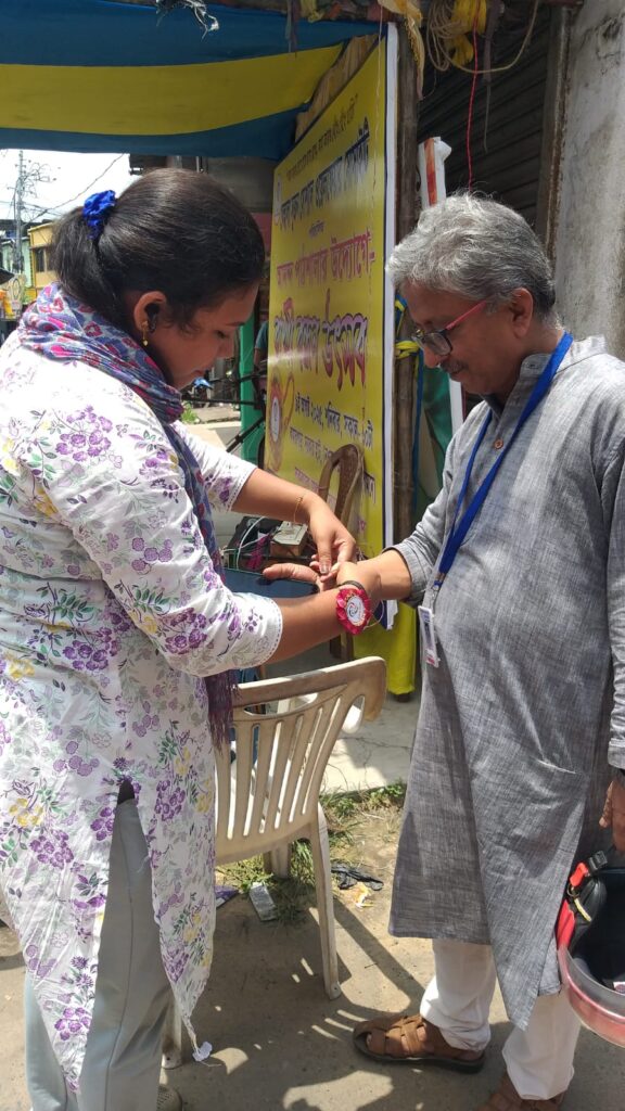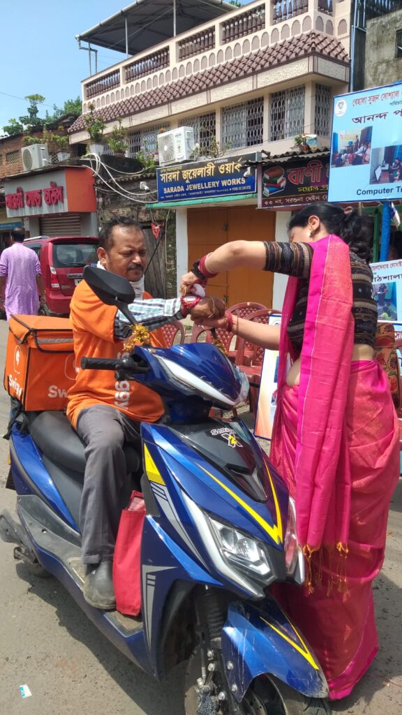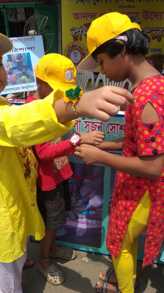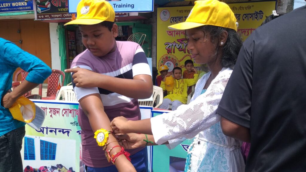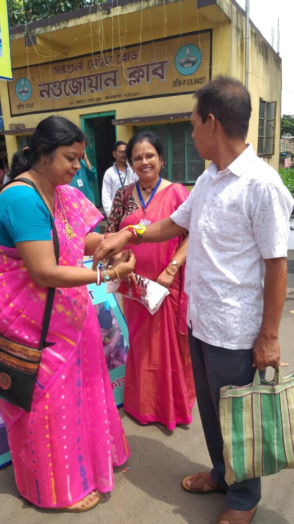 Taking this idea one step further, Behala Sujan Social Welfare Society did something remarkable: on 9th August 2025, they organized a rakhi ceremony where the students of their coaching centre, Anandapathshala tied rakhis to passersby and bystanders. What is more interesting, perhaps, is the fact that each of these rakhis was handmade by the students of this centre; aided by the female members of the organization, the students made around 250 rakhis with enthusiasm and exuberance. In this context, it must be mentioned that Anandapathshala, situated at Sarsuna’s Sarkarhat, Kamarpapa area, is an institution where underprivileged children are given tuitions on various subjects like Mathematics, the Sciences, English, Geography, History; not only this, but they are also encouraged to partake in several extra-curricular activities such as dancing, drawing and crafts, so on and so forth. Additionally, since this is an age in which everything is getting increasingly more digitized as the days proceed, Anandapathshala also focuses on the computer literacy of its children, thereby aiming at a holistic growth and development of its pupils. The Rakshabandhan event, which was attended by Shri Rupak Ganguly, the honourable counsellor of Ward No. 121, involved not only the tying of those handmade rakhis to said passersby, but also the distribution of sweets among them. This was the first time that such an event was organized by Behala Sujan and it was a roaring success.