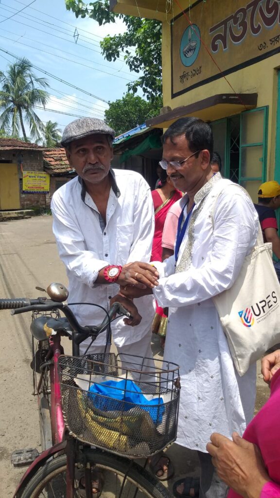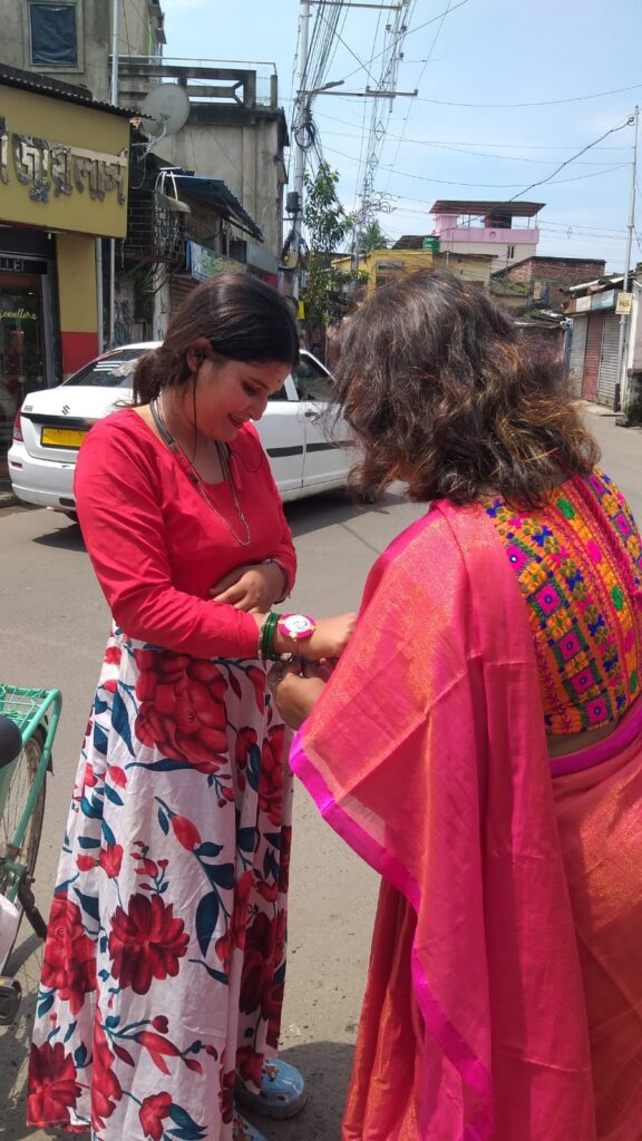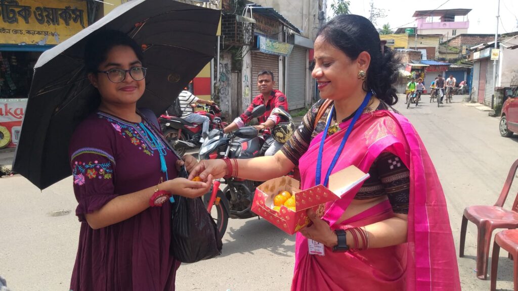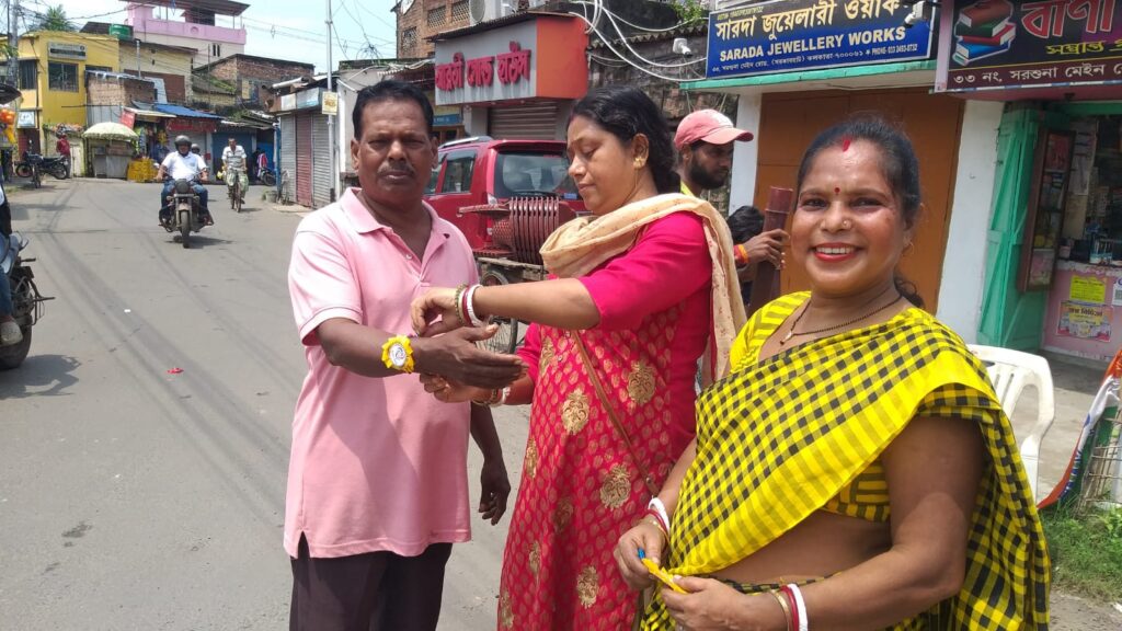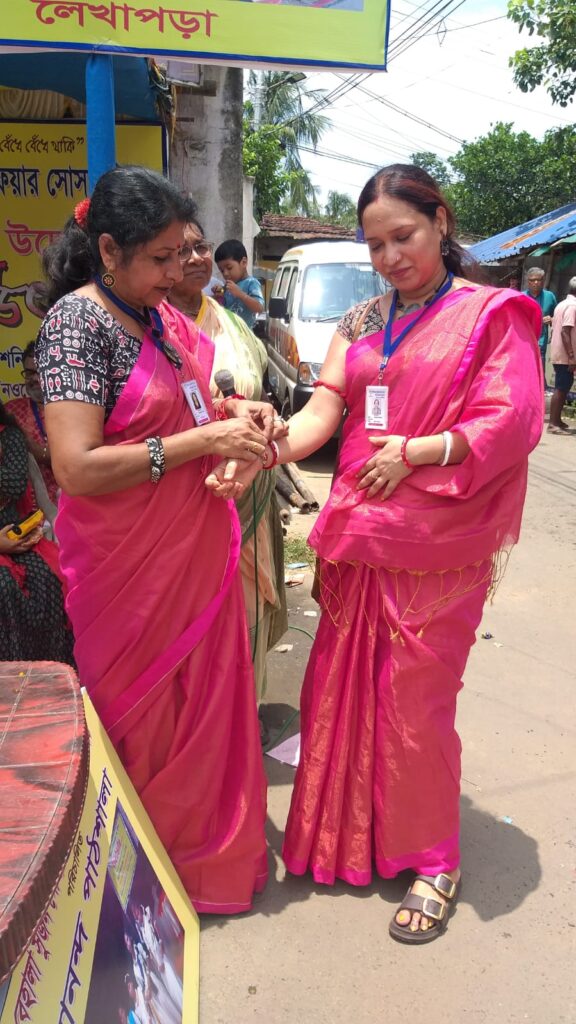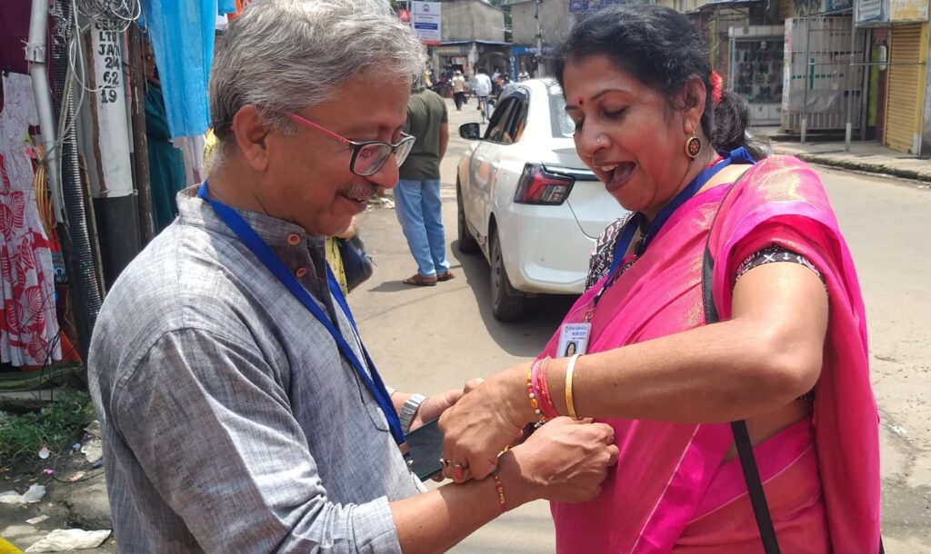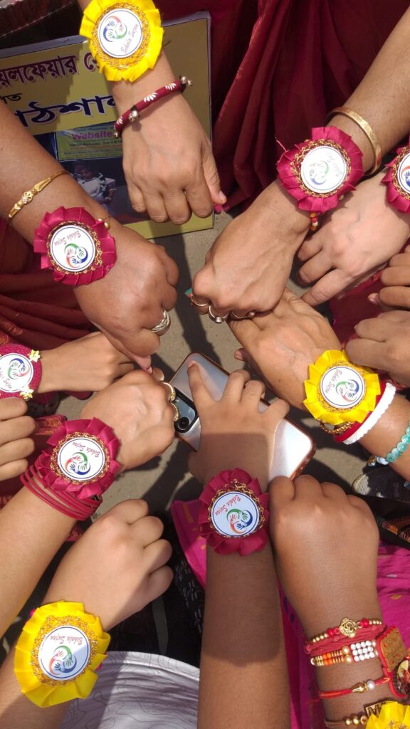 Taking this idea one step further, Behala Sujan Social Welfare Society did something remarkable: on 9th August 2025, they organized a rakhi ceremony where the students of their coaching centre, Anandapathshala tied rakhis to passersby and bystanders. What is more interesting, perhaps, is the fact that each of these rakhis was handmade by the students of this centre; aided by the female members of the organization, the students made around 250 rakhis with enthusiasm and exuberance. In this context, it must be mentioned that Anandapathshala, situated at Sarsuna’s Sarkarhat, Kamarpapa area, is an institution where underprivileged children are given tuitions on various subjects like Mathematics, the Sciences, English, Geography, History; not only this, but they are also encouraged to partake in several extra-curricular activities such as dancing, drawing and crafts, so on and so forth. Additionally, since this is an age in which everything is getting increasingly more digitized as the days proceed, Anandapathshala also focuses on the computer literacy of its children, thereby aiming at a holistic growth and development of its pupils. The Rakshabandhan event, which was attended by Shri Rupak Ganguly, the honourable counsellor of Ward No. 121, involved not only the tying of those handmade rakhis to said passersby, but also the distribution of sweets among them. This was the first time that such an event was organized by Behala Sujan and it was a roaring success.