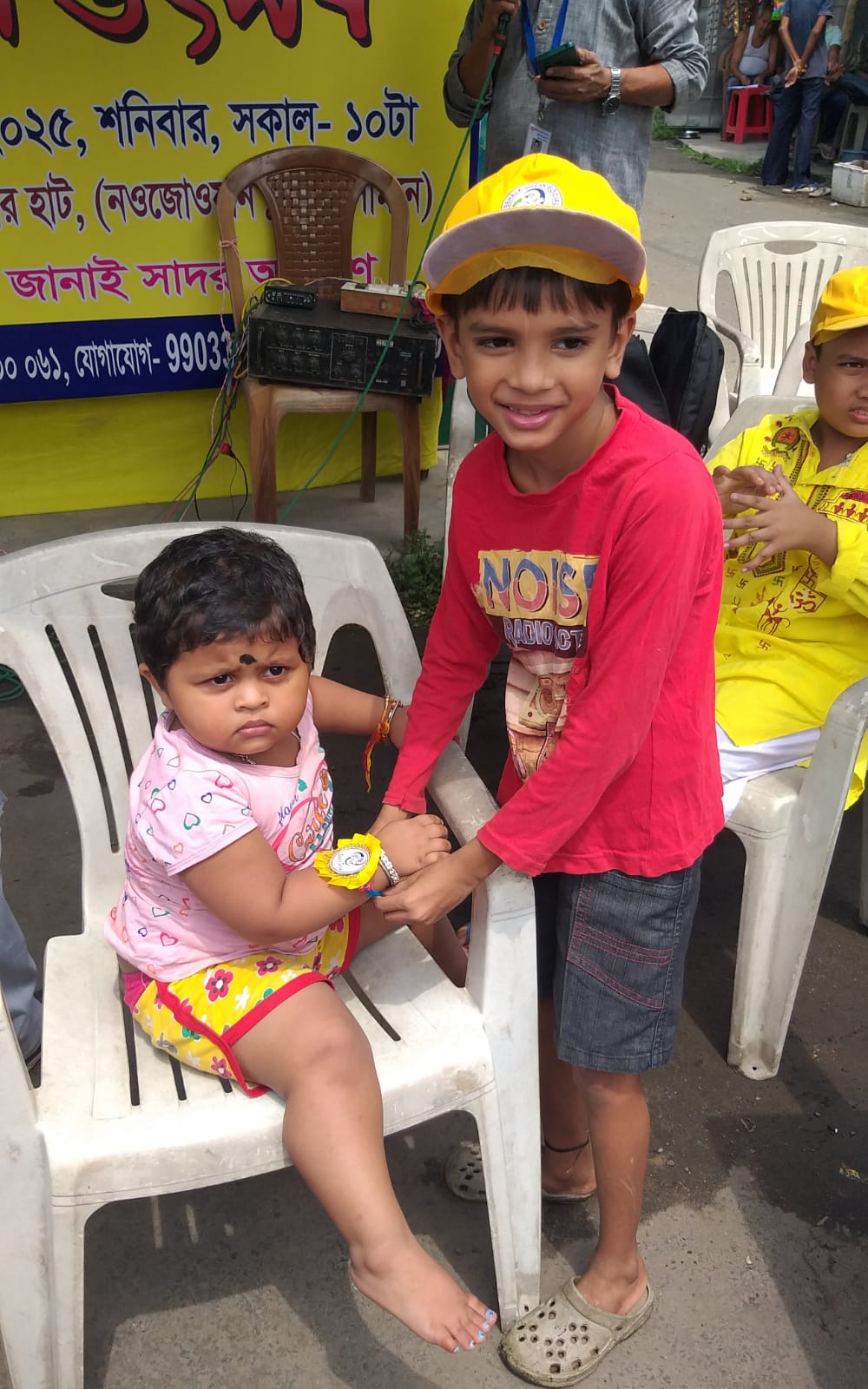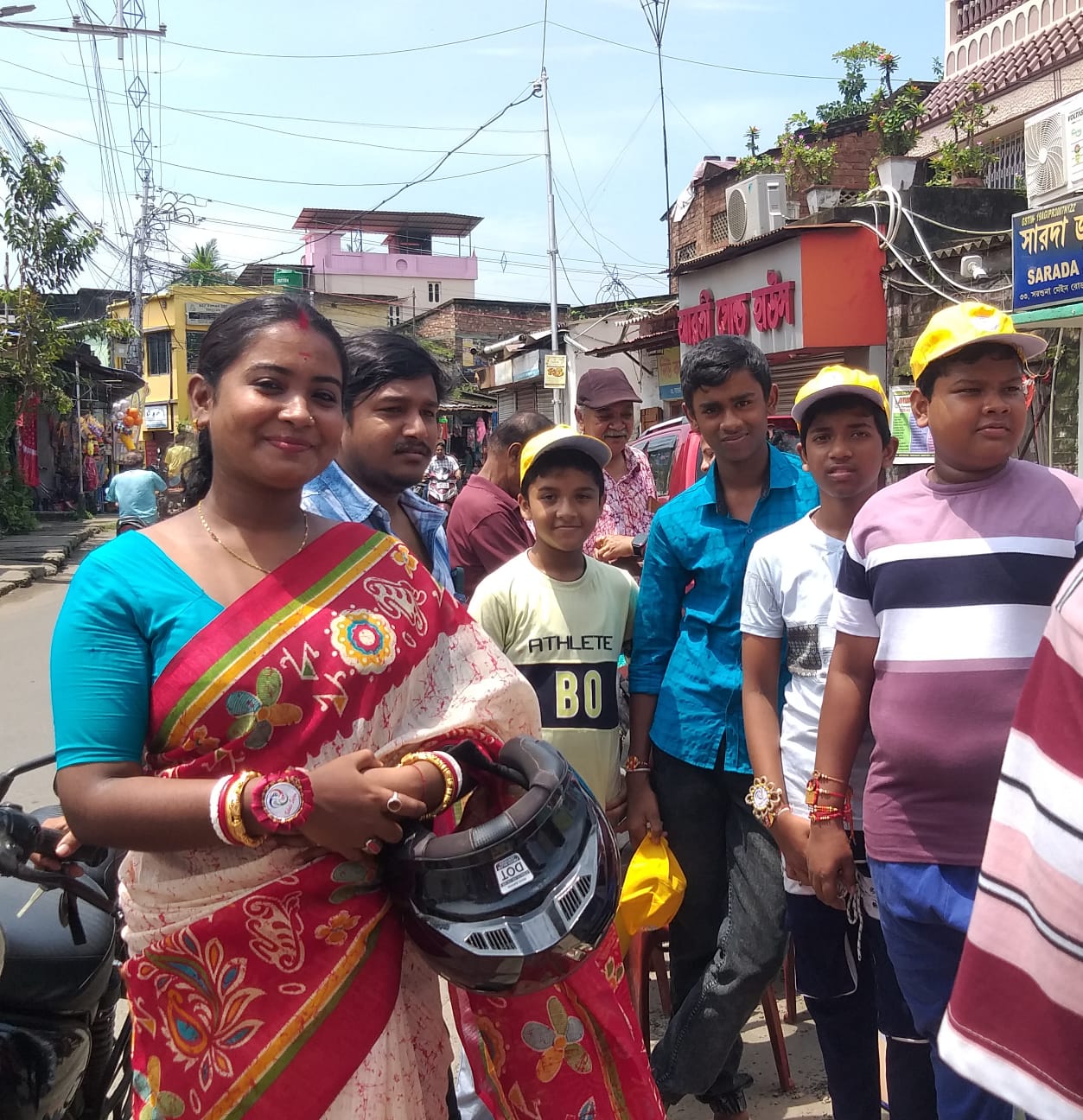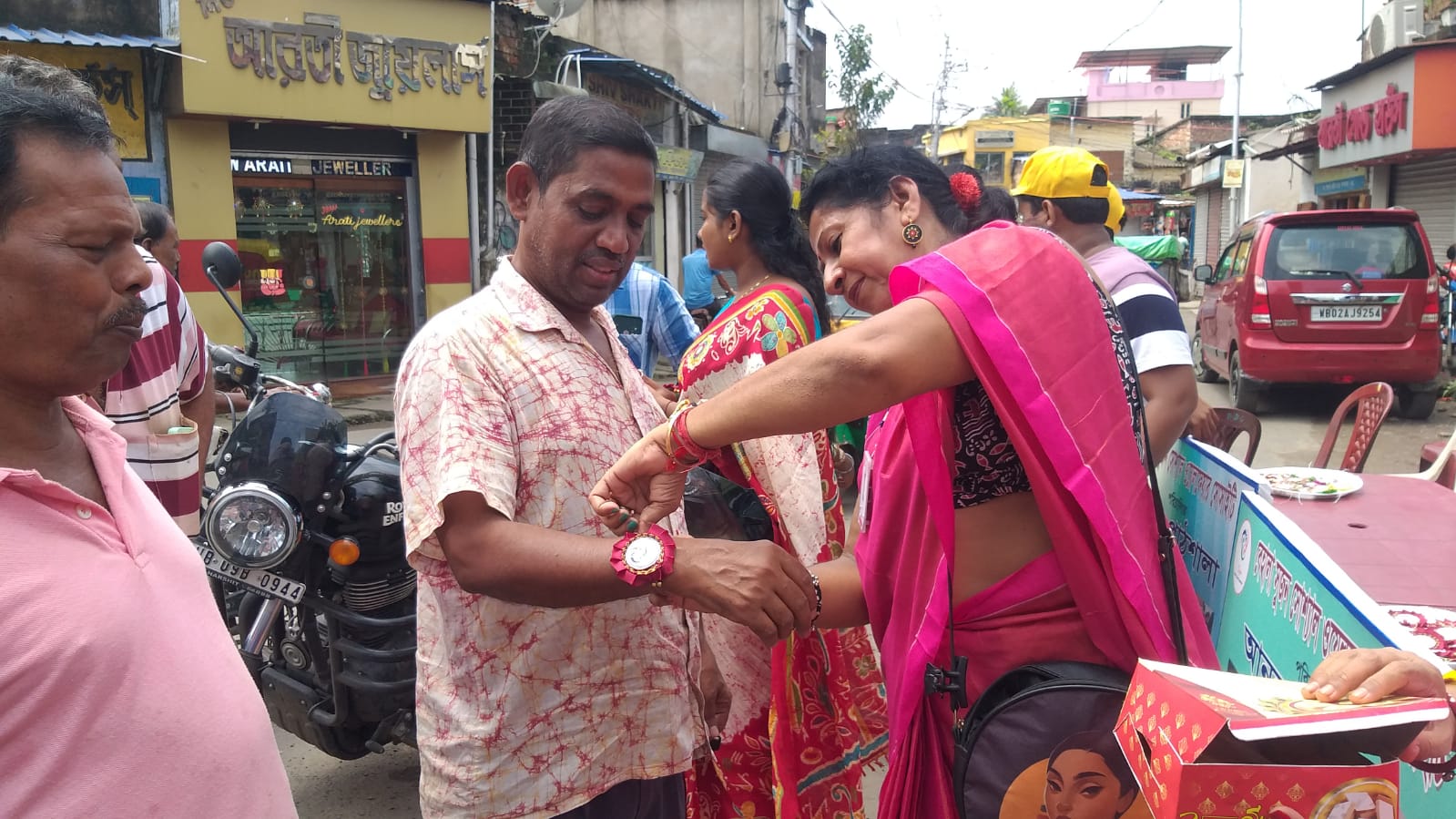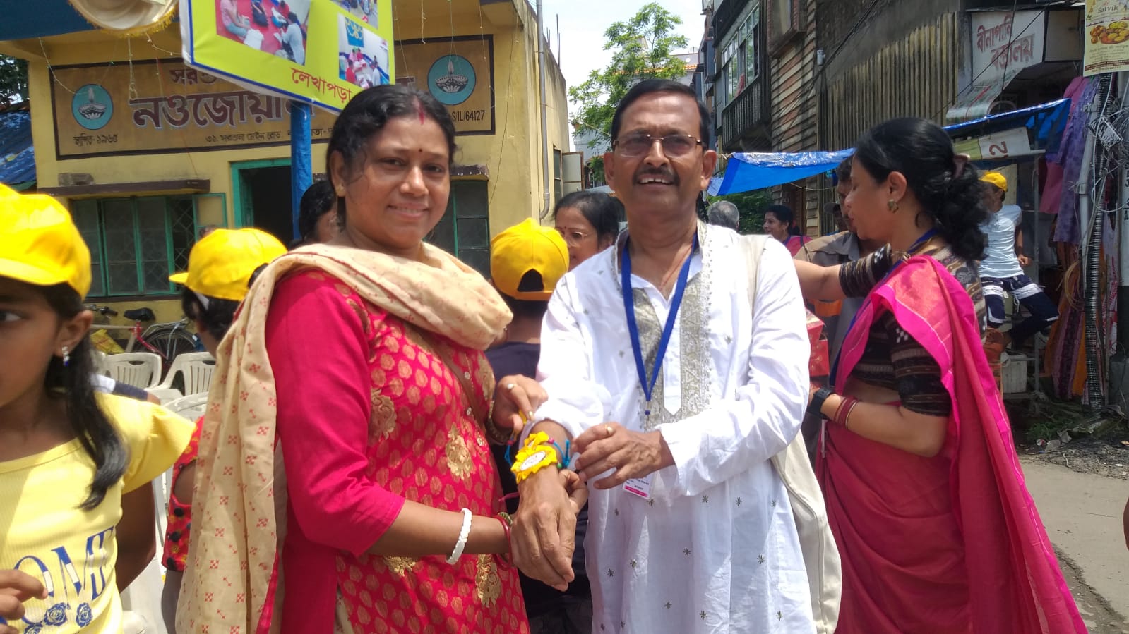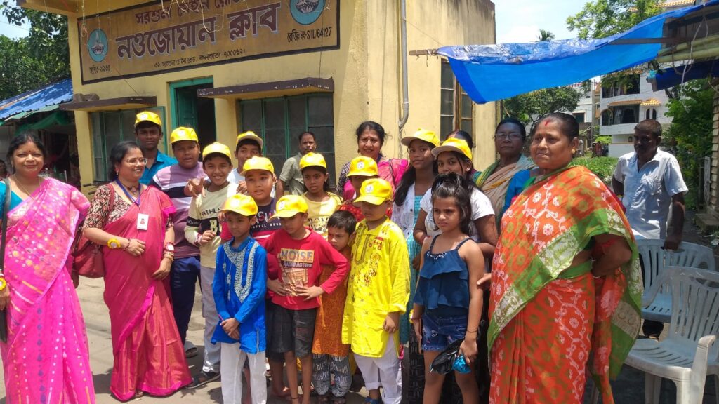 Taking this idea one step further, Behala Sujan Social Welfare Society did something remarkable: on 9th August 2025, they organized a rakhi ceremony where the students of their coaching centre, Anandapathshala tied rakhis to passersby and bystanders. What is more interesting, perhaps, is the fact that each of these rakhis was handmade by the students of this centre; aided by the female members of the organization, the students made around 250 rakhis with enthusiasm and exuberance. In this context, it must be mentioned that Anandapathshala, situated at Sarsuna’s Sarkarhat, Kamarpapa area, is an institution where underprivileged children are given tuitions on various subjects like Mathematics, the Sciences, English, Geography, History; not only this, but they are also encouraged to partake in several extra-curricular activities such as dancing, drawing and crafts, so on and so forth. Additionally, since this is an age in which everything is getting increasingly more digitized as the days proceed, Anandapathshala also focuses on the computer literacy of its children, thereby aiming at a holistic growth and development of its pupils. The Rakshabandhan event, which was attended by Shri Rupak Ganguly, the honourable counsellor of Ward No. 121, involved not only the tying of those handmade rakhis to said passersby, but also the distribution of sweets among them. This was the first time that such an event was organized by Behala Sujan and it was a roaring success.